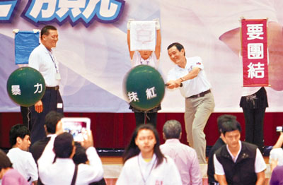 ■馬英九出席「馬吳體育界後援總會」成立大會,打破寫著「抹紅」和「暴力」的氣球。 中央社
