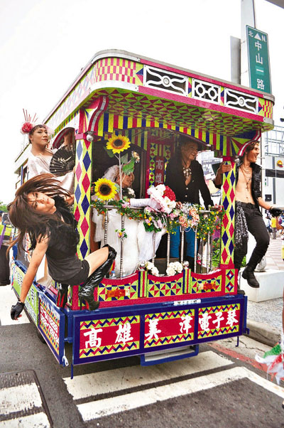在高雄,來自各地數千名同志上街遊行,彷彿是場嘉年華,還有電子花車搭載反串鋼管女郎的男同志沿街表演。中央社