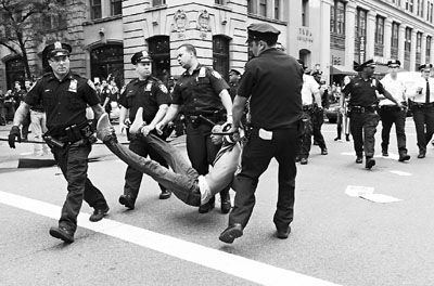 紐約「佔領華爾街」示威進入第2周,警方繼續重兵封鎖紐約證交所大門,示威者只能在3條街外紮營靜坐,聲討華爾街企業貪婪。前日過百名示威者試圖遊行到曼哈頓下城,警方拘捕至少85人(見圖),但有示威者稱他們和平抗爭,警方卻過度使用武力,向被包圍的示威者噴胡椒噴霧,還有臉上流血的示威者從地上被拉起扣上手銬。