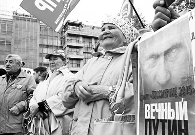 俄羅斯總理普京鐵定明年再參選總統後,隨即惹來反對派聲討。約300人前日在莫斯科克里姆林宮附近示威,高舉橫額要求「普京滾蛋」,形容大選是「鬧劇」。倘普京順利回朝,現總統梅德韋傑夫將再度成為總理,任職逾10年的財長庫德林表示,由於無法化解自己與梅氏的分歧,故堅拒加入新政府。