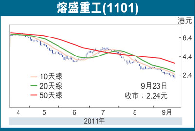 此股上周五在造出2.02元的年內低位後,反覆回升至2.24元,漲3.7%,而較低位回升的幅度達1成,彈力頗見強橫。就估值而言,該股現價PE為6.11倍,2011年預期PE約3倍,在同業中處偏低水平,而PB約0.93倍,相比不少同業PB多逾2倍,無疑亦具吸引。趁股價有成功尋底的機會跟進,中線博反彈目標為50天線的3.7元。
