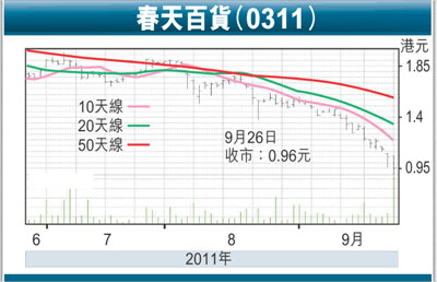 管理層之前對第三季趨勢亦維持正面看法,目標全年增長15%-17%。瑞銀在發展研究報告中,基於春天百貨具購物中心先驅優勢,以及現價估值被低估,維持其「跑贏大市」評級。雖將其目標價由2.7元下調至1.9元,相當於2012/13年預期市盈率14/11倍,但較現價尚有近98%的上升空間。在股價正處於尋底階段部署收集,博反彈目標為50天線的1.59元。