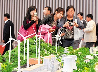 27日,在山西太原舉行的第六屆中國中部投資貿易博覽會上,煤炭及煤層氣、發電與輸電、新能源與可再生能源等領域都是此次展示的重點。圖為人們在參觀華潤集團的風力發電模型。 新華社