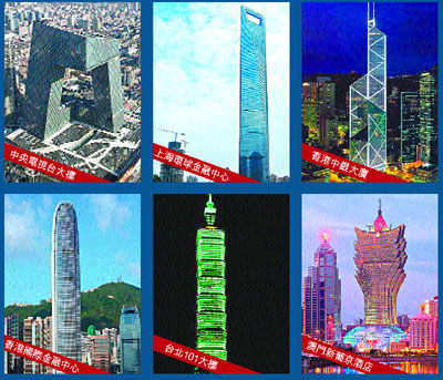 台北的101大樓因其擁有全球最快電梯而入選,37秒就可以把乘客從5樓送到最高樓,此種設計象徵中華文化永續不息的力量。樓高261公尺的新葡京酒店成為澳門地區唯一入選的標誌性建築,該大樓的設計靈感是來自巴西女郎跳舞時戴的長羽頭飾,據傳頭大身小的瓶頸設計是考慮了中國風水原因,可以防止漏財,有助在內經營的商家。