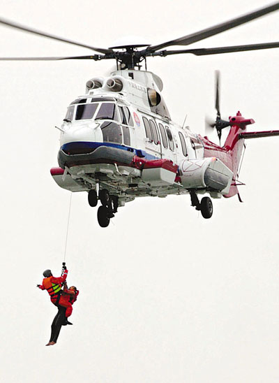 9月26日,一架海上救助直升飛機在北海港附近演練救助「落水漁民」。當日,廣西各部門聯合在廣西北海市石步嶺深水碼頭北側附近約6公里海域,舉行軍地海上搜救演練,以進一步提高軍地聯合海上搜救能力。 新華社