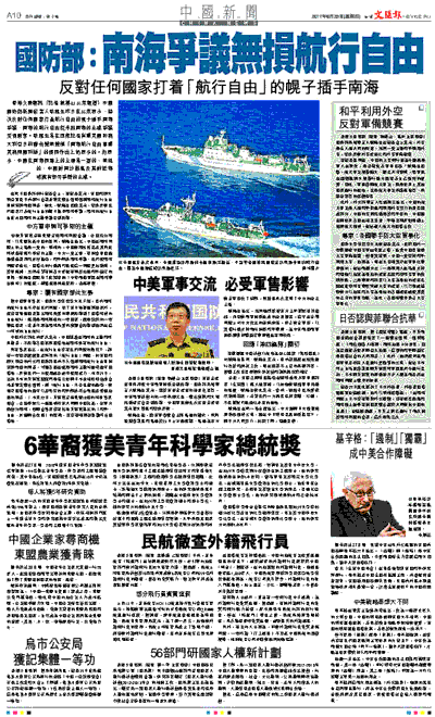 香港文匯報訊(記者 劉越山 北京報道)中國國防部新聞發言人耿雁生昨日在北京表示,堅決反對任何國家打著航行自由的幌子插手南海爭議,南海的航行自由從未因南海的主權爭議受到影響。耿雁生是在回應記者有關美國和澳大利亞日前聯合聲明聲稱「南海航行自由事關美澳兩國利益」的提問作出上述表示的。他表示,中國在南海問題上的立場是一貫的、明確的,中國對南沙群島及其附近海域擁有無可爭辯的主權。