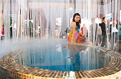 ■一線城市房地產銷量驟減,觀望氣氛濃厚。圖為泳裝模特展示溫泉樓盤項目。新華社