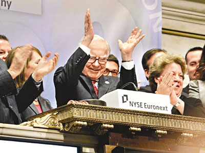 ■美股昨日開市時,由股神巴菲特主持鳴鐘儀式,令交易所人員振奮。美聯社