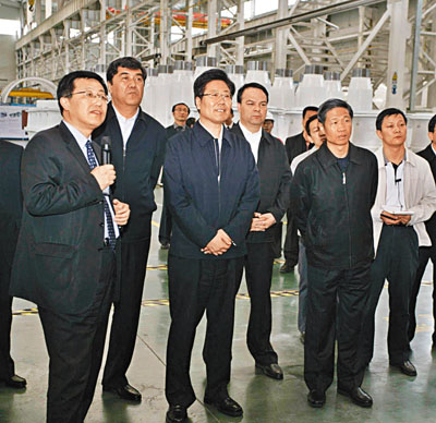 ■維吾爾自治區黨委書記張春賢(中)等領導在董事長武鋼(左一)的陪同下到金風科技視察指導工作