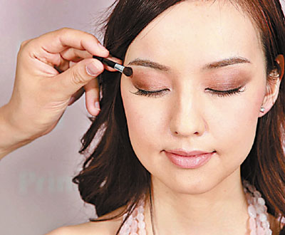 以AUBE彩妍明眸眼影組合(#552棕色系)內的深啡眼線粉勾劃鬆蒙的眼線。再大範圍於整個眼窩至近眼眉位置塗上啡色眼影,近眼頭、鼻樑的位置較深色令鼻樑顯得更高,而於眼尾位置則逐漸淡開,營造今年最型格的smoky eyes。