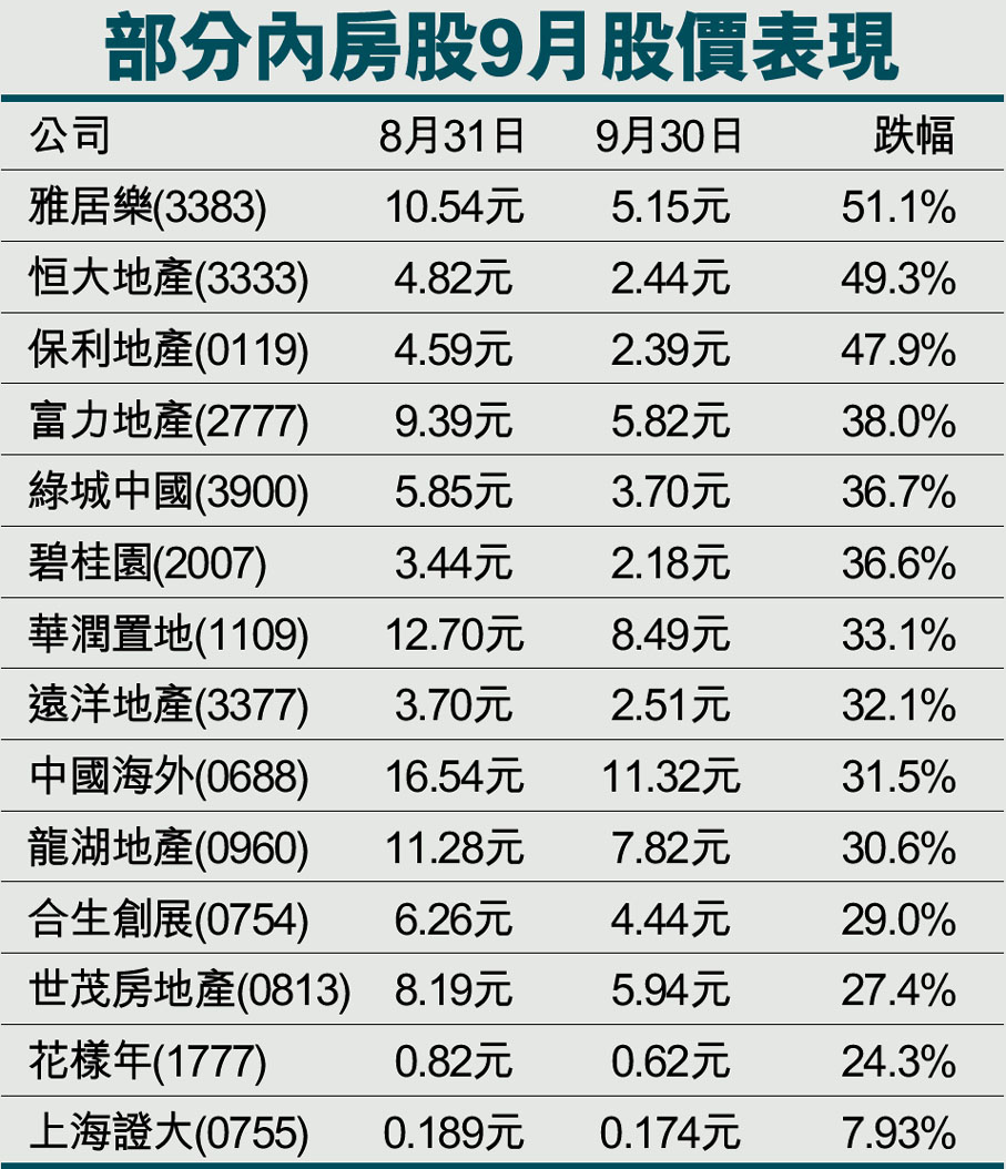 部分內房股9月股價表現 (圖)