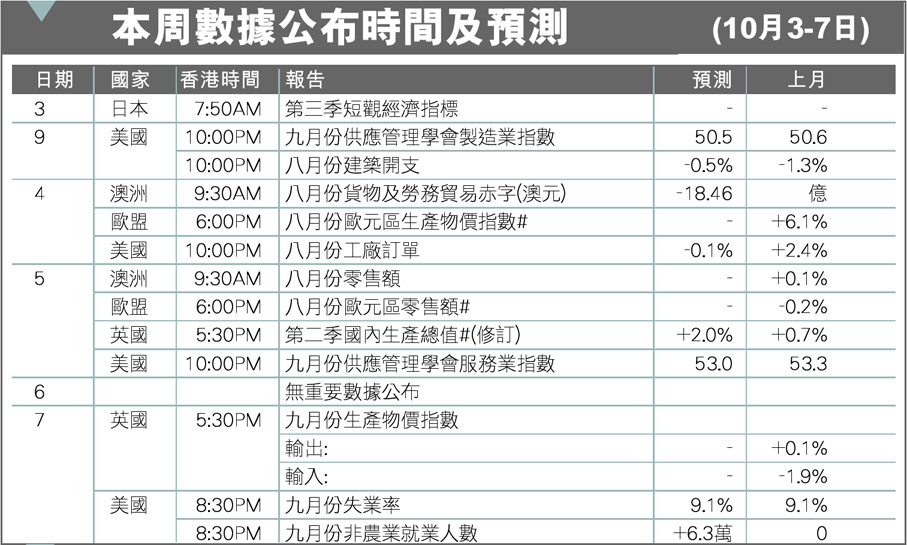 本周數據公布時間及預測(10月3-7日) (2011-10-03) (圖)