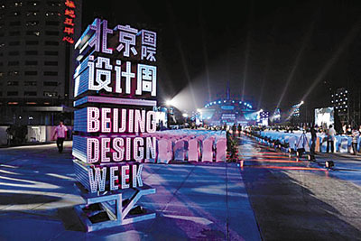 ■開幕式現場,燈光交相輝映的世紀壇青銅甬道旁,佇立著設計周的立體標誌。 資料圖片