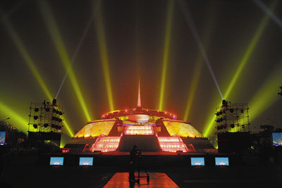 開幕式當晚,以「設計的思維」為主題的新媒體立體建築秀在中華世紀壇上演。香港文匯報記者 王添翼 攝