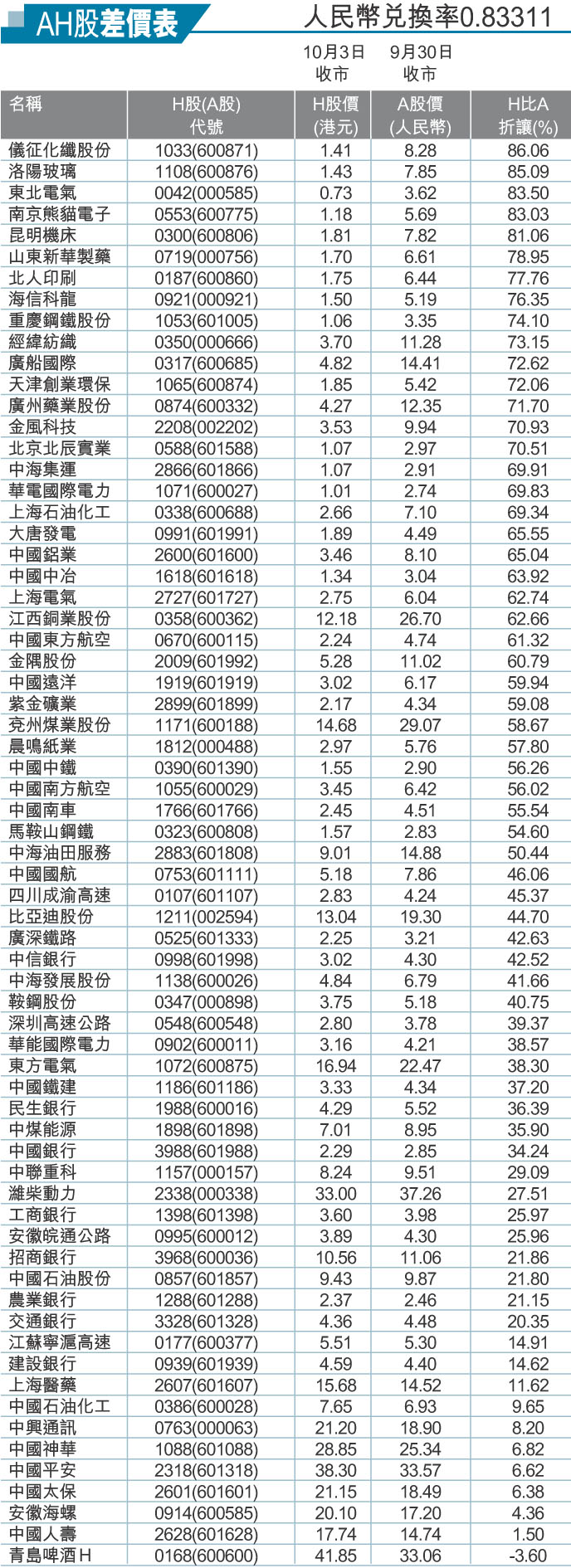AH股差價表(人民幣兌換率0.83311) (2011-10-04) (圖)