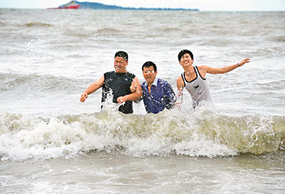 ■4日,受「尼格」影響,三亞市突降大雨,三亞灣海浪翻滾。許多遊客在海邊玩水嬉戲。 中新社