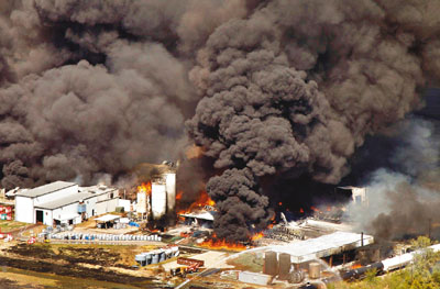 美國達拉斯沃克西哈奇市一間化工廠前日發生大火(見圖),期間數次爆炸,冒出大量毒煙,吸入對身體有害,有指化學氣味如燒保鮮紙般難聞,吸入後令人頭痛欲裂,約1,000名居民一度緊急撤離。有人形容爆炸恍如原爆,非常可怕。 ■《每日郵報》/綜合外電消息/路透社