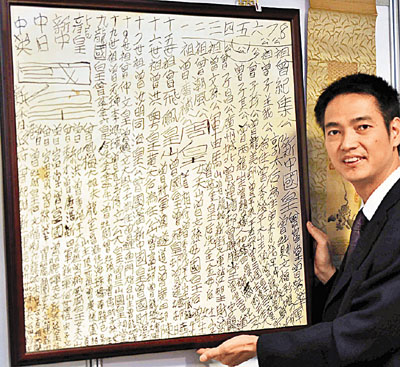 香港普藝拍賣行昨日展示一批即將拍賣的收藏品。「九龍皇帝」曾灶財「駕崩」4年多,生前筆跡遍及港九各區,因內容異常,留給市民深刻印象。圖中一幅遺墨,敘述自己以及家族的事跡,自稱「國皇」,其妻文福彩為「皇后」。 中通社