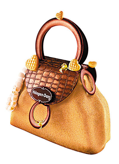每位女士總對手袋有說不出的情意結,想不到最近筆者在Haagen-Dazs看見了一個如手袋般的雪糕蛋糕,名為Chocolate Vogue雪糕蛋糕,由榮獲2000年法國最佳工藝獎M.O.F(Meilleurs Ouvriers de France Patisserie)的大師Jean-Francois ARNAUD親自設計,手袋以朱古力皮革紋理製作及手袋糖皮包處理,全人手打造,工序複雜繁多,每日限量製造10個。
