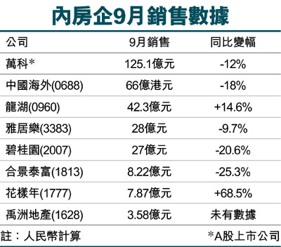 ¡@¥«³õ¦¨¥æ©ñ½w¡A¤º¦a¤j«¬©Ð¦a²£¶}µo°Ó¸U¬ì¤Î¤¤°ê®ü¥~(0688)9¤ë©Ð¦a²£¾P°âÃB¦P¤ñ¶^¹O¤@¦¨¡C¸U¬ì¦]±À½L¶qªº¼W¥[¡A·í¤ë¾P°âÃBÀô¤ñ¤É19.4%¡A¦ý¦P¤ñ¤U°12%¡A¬°³sÄò²Ä¤G¤ë¥X²{¦P¤ñ¤U·Æ¡C¤¤°ê®ü¥~(0688)·í¤ë¹ê²{¾P°âÃB66.0»õ´ä¤¸¤Î¾P°â±¿n49.2¸U¥¤è¦Ì¡A¦P¤ñ¤À§O¤U°18.0%©M13.2%¡AÀô¤ñ«h¼W48.4%©M48.3%¡C