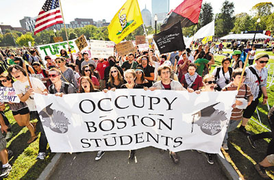 ■美經濟持續低迷、失業率高企,引發多個城市「佔領」行動。圖為昨日反金融貪婪示威者「佔領」波士頓。 法新社