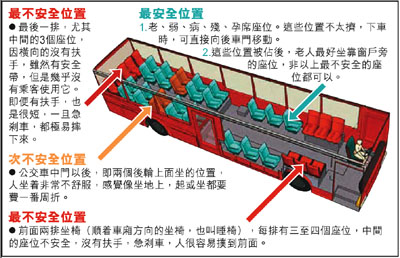 乘客徐麗坐在巴士後門正對的位置上,她表示,自己選擇這個位置並不是完全出於安全的考慮,而是覺得這個離車門近,到時候萬一車上人多打擠,自己也能很快下車,當然曾經父母也提醒過自己乘車要坐中間。「可能兩個因素加起來就讓我自然而然地選擇了這個位置吧。」她笑著稱。