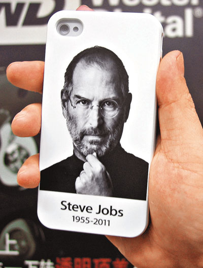 ■深圳商販展示印有喬布斯樣貌和生卒年份的iPhone 4 機身。法新社