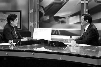 ■馬英九(右)亮相電視台接受專訪。中央社