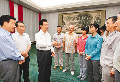 ■中共第十七屆六中全會確定「文化主題」。圖為中共中央總書記、國家主席胡錦濤等月前觀看話劇《郭明義》後接見該劇劇組主創人員。 資料圖片