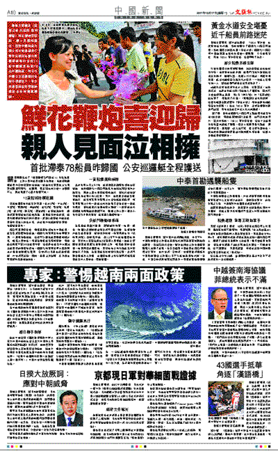 香港文匯報訊(實習記者 芮田甜 昆明報道)鮮花鞭炮喜迎歸,親人見面相擁泣!因受中國船員在湄公河水域遇襲身亡事件影響而滯留在泰國清盛港的首批11艘中國籍貨船和78名中國船員,昨日在中國公安巡邏艇的全程引領護送下,平安抵達雲南省西雙版納傣族自治州關累碼頭。