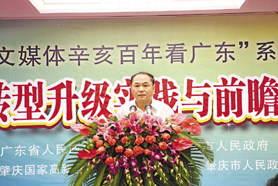 海外華文媒體團在參與研討會之前,先於上午參觀了位於大旺的肇慶國家高新區。肇慶市委常委、高新區委書記劉龍平(見圖)介紹,該區於2010年9月成功升級為國家高新區,短短8年多時間,以「雙轉移」促「雙提升」,實現了從一般工業園區到國家高新區的轉型升級。