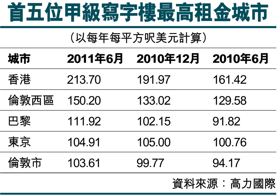 首五位甲級寫字樓最高租金城市(以每年每平方呎美元計算) (圖)