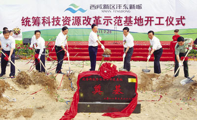 ■陝西省委書記趙樂際(左四)、省長趙正永(右三)、副省長江澤林(左三)等領導,為內地唯一統籌科技資源改革示範基地奠基。