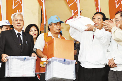 ■宋楚瑜獲民眾熱情送上連署書,讓他面露歡顏。 中央社