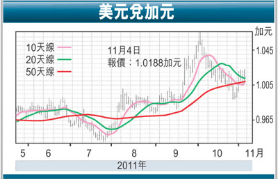 另一方面,G20峰會沒有對紓緩歐債危機提供實質協助之後,投資者已頗為憂慮主權債務危機將會蔓延至意大利,再加上希臘政局的不明朗亦隨時增添市場的變數,故此歐元匯價暫時將不容易出現較大幅旳反彈,這亦對商品貨幣的表現構成負面影響。受到國際原子能機構將於本周發表伊朗核報告影響,紐約期油上周五已徘徊於每桶94美元水平的近期高位,該情況將可能會減慢加元的跌勢,所以預料加元匯價將會略為走低至1.0280水平。
