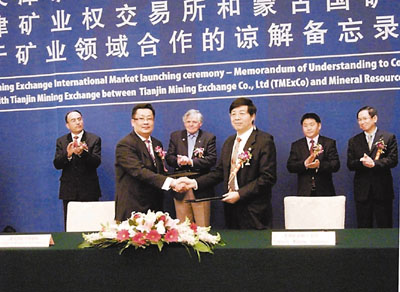 6日,天津礦業權交易所與蒙古礦產資源局簽署合作備忘錄,根據協議,蒙古礦業企業將利用交易所電子交易系統開展國際市場營銷、交易、招標、清算和結算活動,天津礦業權交易所為國際投資人在蒙古國辦理礦政業務提供信息交流和服務,鼓勵和支持蒙古國礦業企業利用天津礦業權交易所國際融資平台,為蒙古國大型礦業基礎設施建設發行基礎設施基金,為蒙古國礦產品交易建設交割倉庫。