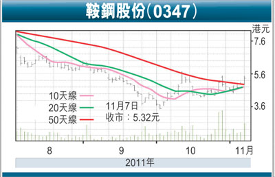 另一方面,2012年鐵礦石價格總體有望下降,鋼企成本壓力將有所緩解,鞍鋼也可望從中受惠。事實上,近期鐵礦石價格出現大幅回調,進口礦價已下降至130美元/噸左右。就業績表現而言,鞍鋼較早前公布截至今年9月底止首3季業績,首3季營業總收入為697.16億元(人民幣,下同),上升2.6%;盈利則為2.39億元,大跌90.7%,每股盈利為3.3分。不過,第3季業績出現虧轉盈1,900萬元,每股盈利0.3分,上年同期則虧損為1.7億元。單睇業績自然難恭維,不過中央已發布鋼鐵業「十二五」規劃,有利鞍鋼等龍頭企業的業務拓展,而鐵礦石價格自高位顯回落,也有利減輕經營成本,所以對該股後市已不宜看得太淡。