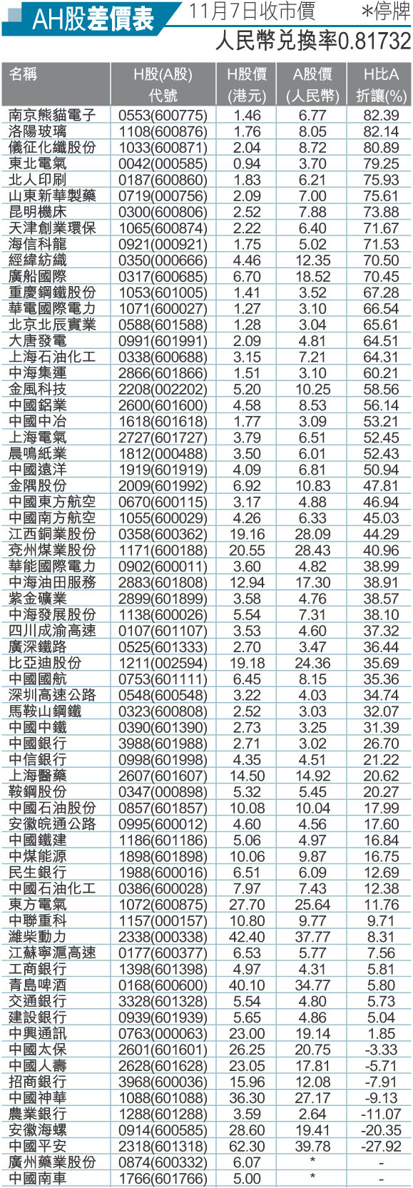 AH股差價表(11月7日收市價) (2011-11-08) (圖)