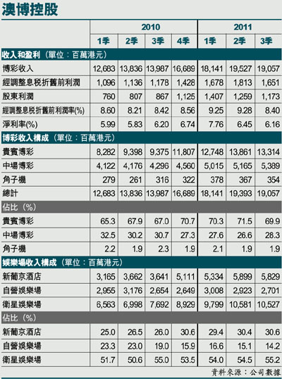 澳博控股(0880)公布了2011年3季度業績。總博彩收入同比增長36%,低於行業增速48%。貴賓博彩收入同比增長43%,贏率維持在2.88%。但是,澳門銀河開業之後總博彩收入環比下滑2.4%,今年2-3季度市場份額下滑2.5%。