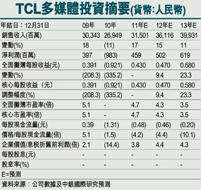 ¡@§Ú̹ïTCL¦h´CÅé(1070)º¦¸µû¯Å¬°¶R¤J¡A°ò©ó7¿2011¦~¹w´Á¥«¬Õ²v¡Aµ¹¤©3.01´ä¤¸ªº¥Ø¼Ð»ù¡C§ÚÌ»{¬°¤½¥q¥Ø«e¸gÀç¨}¦n¡A¥¿¬O´£¤É¤ò§Q²vªº¦n®É¾÷¡C§Ú̬ݦn¤½¥qªº¥«³õ©w¦ì©M¦æ·~ªº¼Wªø«e´º¡CÀHµÛLED¹qµø¡B3D¹qµø©M´¼¯à¹qµø¶V¨Ó¶V´¶¤Î¡ATCL¦h´CÅ骺¬Õ§Q±N«ùÄò´£¤É¡C