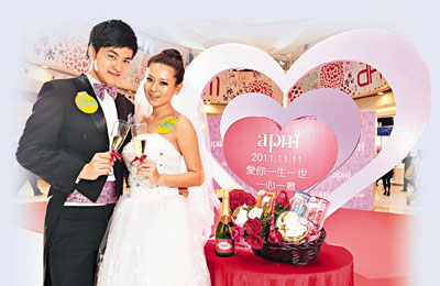 ■Kimi(右)和Patrick(左)拍拖4年,昨公開訂婚,明年12月12日「拉埋天窗」。 商場apm提供