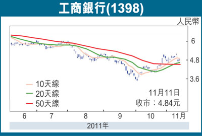 工行往績市盈率8.21倍,2011年預測市盈率料進一步降至6.74倍,本身估值處於歷史低位水平,在同業中也不算貴。此外,該股現價息率4.56厘,亦具不俗吸引力。該股上周四即使有策略股東減持的消息入市,惟依然可以守穩本月初以來低位支持的4.61元之上,可見資金傾向逢低吸納,在股價初現反彈下,料後市有力再度挑戰日前高位阻力的5.22元,而中線目標則睇6元關。