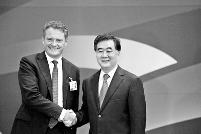 ■汪洋與BP公司董事長思文凱合影。 中新社