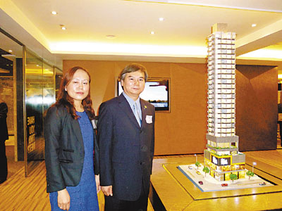 ■宏安地產營業及拓展董事黃耀雄(右)與助理總經理楊桂玲介紹薈點物業模型。香港文匯報記者周穎 攝