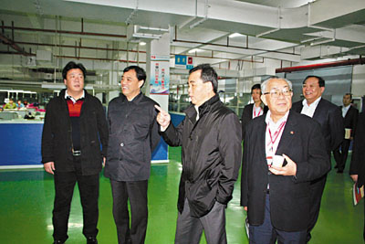 林樹哲、林廣兆、阜陽市委書記宋衛平(左二)等在南源織造有限公司廠房內參觀。