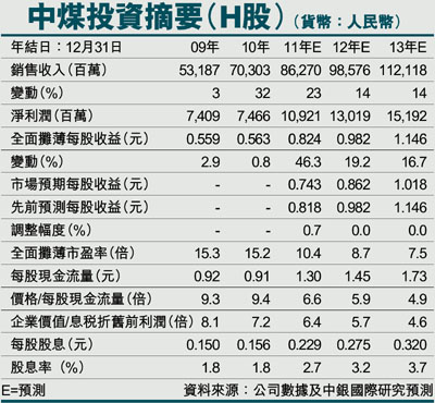 中煤能源仍是我們在H股煤炭板塊的首選買入股票,亦是我們在A股煤炭生產商中的首選買入股票之一。由於預測上調,我們將H股目標價由11.96港元上調至12.05港元,仍對應12倍2011年預期盈利。我們同時將A股目標價由11.46人民幣上調至11.51元人民幣,仍對應14倍2011年預期盈利。