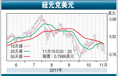 紐元上周受制於80.00美仙水平後,其走勢已進一步趨於偏弱,在先後跌穿78及77美仙水平後,更一度於本周二反覆下滑至76.80美仙附近的5周低位。由於意大利以及西班牙債息的高企已引致市場頗為憂慮歐債危機將可能會繼續蔓延,再加上歐美仍需要進行大幅削減財赤以避免主權債務問題惡化,該些情況將較為不利歐美經濟於稍後的表現,因此當市場的避險情緒還依然是高漲之際,高風險資產以及商品貨幣暫時仍會遭遇到一定的下調壓力,故此預期紐元匯價將會續有反覆下調空間。