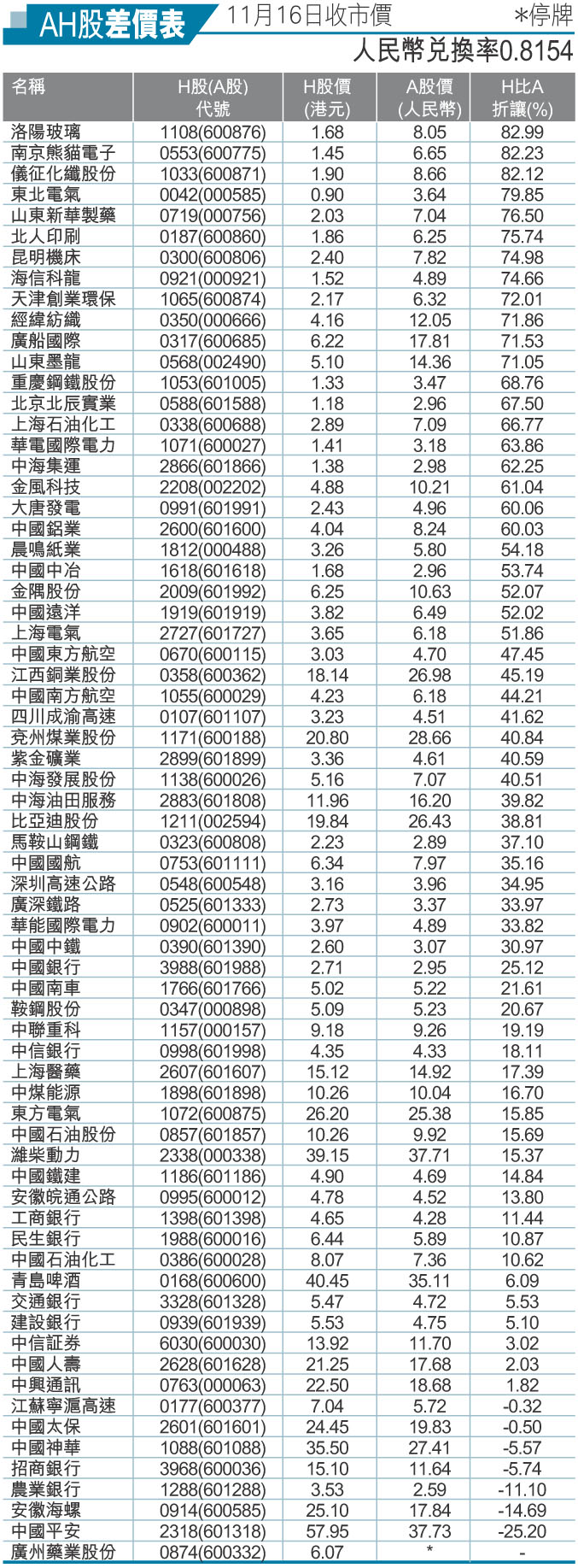 AH股差價表(11月16日收市價) (2011-11-17) (圖)