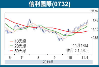 信利近期反彈幅度雖不小,不過其2011年預測市盈率約7.5倍,在同業中只是處於中游位置,而該股現價每股資產淨值1.427元,與現價相若,可見股價也未被過度炒高。若股價短期可以成功突破1.5元的阻力位,下一個目標將上移至去年4月上旬以來的2元阻力位。