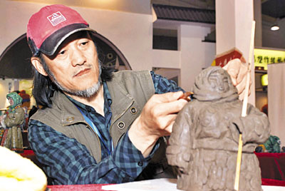 嵊州泥塑的代表人物是工藝大師宓風光。他致力於打響嵊州泥人的品牌,以造型簡潔洗練,著意誇張、寫意、設色精當、艷而不俗,力圖使泥人藝術從「俗」走向「雅」,創出了「泥人宓」的獨特風格。作為浙江泥人的代表,浙江泥人宓與天津泥人張、無錫惠山泥人呈三足鼎立之勢。其漫塑作品針對泥人易碎易裂的弱點,在造型上追求團心結構,在追求泥人敦厚、結實的同時,放開手腳,加強人物形象的誇飾,運用漫畫式的手法,開創了一條泥人漫塑創作的新路。代表作主要有《戲劇百臉譜》、《世界首腦人物漫雕》等。